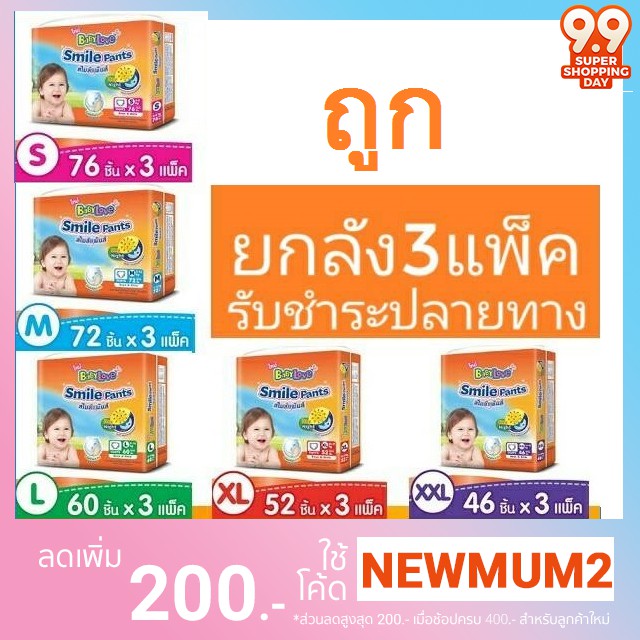 สั่งซื้อครั้งแรกเลือกใช้โค้ดส่วนลดตามสะดวก โค้ดลด100บาท NEWPRAY โค้ดลด200บาท ์NEWMUM2 กดใช้โค้ดส่งฟรีด้วยนะค่ะ จะได้ส่วนลดค่าส่ง40บาทคะ จัดส่งทุกวัน เว้นวันอาทิตย์-วันหยุดนักขัตฤกษ์ รับชำระปลายทาง จำกัด2ลังต่อ1ออเดอร์ มากกว่า2ลังสั่งออเดอร์ใหม่นะคะ คละไซส์พิมตรงข้อความมาค่ะ สำคัญมากชื่อที่อยู่ รหัสไปรษณีย์ กรุณาใส่ให้ถูกต้องชัดเจอ เบอร์โทรใส่เบอร์หลักที่สามารถติดต่อได้ สินค้าจะได้ถึงมือคุณลูกค้าอย่างรวดเร็วถูกต้อง ขอบพระคุณมากค่ะ เบบี้เลิฟ สไมล์แพ้นส์ ยิ้มได้ทั้งกลางวันกลางคืน - ไซส์ S เหมาะสำหรับเด็ก 4 - 8 กก. - ไซส์ M เหมาะสำหรับเด็ก 7-12 กก. - ไซส์ L เหมาะสำหรับเด็ก 9-14 กก. - ไซส์ XL เหมาะสำหรับเด็ก 12-17 กก. - ไซส์ XXL เหมาะสำหรับเด็ก 15-25 กก babyloveกางเกงผ้าอ้อมยกลังpantsผ้าอ้อมยกลัง ฉลองมหกรรมลดราคาครั้งยิ่งใหญ่ที่สุดแห่งปี 9.9 Super Shopping Day ลูกค้าใหม่รับส่วนลด 200.- เพียงใช้โค้ด NEWMUM2 และโค้ดอื่นๆ สำหรับสินค้าหมวดหมู่แม่และเด็กเท่านั้น หมดเขต 30 ก.ย. 61 ช้อปเลย ShopeeTH