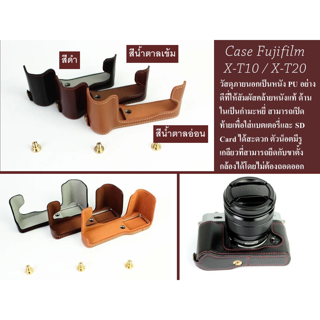 **PROMOTION ส่วนลด** สมาชิกใหม่ใช้โค๊ด NEWKASS ได้รับส่วนลด 100 บาท เมื่อซื้อสินค้าตั้งแต่ 200 บาทขึ้นไป *สำหรับการซื้อทาง Application เท่านั้นซื้อสินค้าตั้งแต่ 250 บาทขึ้นไป มีส่วนลดค่าส่งสินค้า** ทางไปรษณีย์ 30 บาท / KERRY 65 บาท **KERRY รับส่งสินค้าที่สาขา คือ ผู้ขายนำพัสดุไปส่งที่ศูนย์บริการ KERRY ด้วยตนเอง และทาง KERRY จะนำส่งสินค้าไปให้ถึงตามที่อยู่ของลูกค้า ภายใน 1-3 วันทำการครับ** -------------------------------------------------- Case สำหรับกล้อง Fujifilm X-T10 และ X-T20 วัสดุภายนอกเป็นหนัง PU อย่างดีที่ให้สัมผัสคล้ายหนังแท้ ด้านในเป็นกำมะหยี่ช่วยป้องกันรอยขีดข่วน สามารถเปิดท้ายเพื่อใส่แบตเตอรี่และ SD Card ได้สะดวก ตัวน็อตมีรูเกลียวที่สามารถยึดกับขาตั้งกล้องได้โดยไม่ต้องถอดเคสออก JRR half PU case fujixt10 XT10 XT20 fuji fujifilm X-T10 X-T20 เคส ฟูจิ camera cameracase กล้อง
