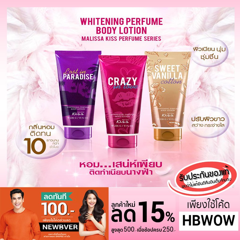 ขายถูกๆ กันเลย [หอมมาก]New Malissa Kiss Whitening Perfume Body Lotion โลชั่นตัวขาว [ติดทนนาน][ขายดี] ราคาถูก ส่งฟรี เก็บเงินปลายทาง รับของที่หน้าบ้านได้เลย อย่ารอช้าคลิกเลย >>สั่งซื้อออนไลน์