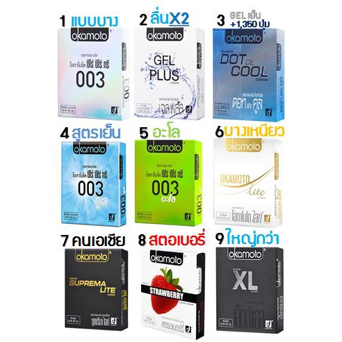 **** ไม่ต้องกังวล ทางร้านไม่ระบุรายละเอียดสินค้าหน้ากล่องให้นะค้า ******** ลูกค้าใหม่ของ Shopee สั่งซื้อออเดอร์แรก code ส่วนลด = NEWSRW ลด 100 บาทนะค้า :) ลูกค้าเก่าราคาปกติก็ถูกมากๆเลยค่า -- ถ้ามีโปรโมชั่นจะอัพเดทราคาให้นะค้า :) ส่ง Kerry สามารถชำระเงินปลายทางได้ ----------------------------------------------------------------------------------- ผลิตโดย บริษัท โอกาโมโต อินดัสทรี อิงค์ จำกัด ประเทศญี่ปุ่น (ผลิตในญี่ปุ่น นำเข้าไทย) (ผลิตตามมาตรฐานสากล ISO 4074:2002 ทุกชิ้นผ่านการทดสอบด้วยเครื่องมืออิเล็กทรอนิกส์เรียบร้อยแล้ว) 1.) แบบบาง ลักษณะเด่น: บางเหมือนไม่ได้ใส่ ผิวสัมผัส: ผิวเรียบ แบบบาง สารหล่อลื่น: มีสารหล่อลื่น ขนาดรองรับ: 52 มม. ความหนา: 0.03-0.038 มม. ส่วนปลาย: ปลายกระเปาะ สี: โปร่งแสง กลิ่น/รส: ธรรมชาติ จำนวนบรรจุ: 2 ชิ้น/กล่อง ใบอนุญาตเครื่องมือแพทย์เลขที่: อย. ผ.5/2554 2.) แบบสารหล่อลื่นx2 ลักษณะเด่น: เจลหล่อลื่นมากพิเศษ ลื่นปรื้ด ลดการระคายเคือง ผิวสัมผัส: ผิวเรียบ แบบบาง สารหล่อลื่น: มีสารหล่อลื่น ขนาดรองรับ: 52 มม. ความหนา: 0.06 มม. ส่วนปลาย: ปลายกระเปาะ สี: ธรรมชาติ กลิ่น/รส: ธรรมชาติ จำนวนบรรจุ: 2 ชิ้น/กล่อง ใบอนุญาตเครื่องมือแพทย์เลขที่: อย. ผ.9/2554 3.) OKAMOTO DOT DE COOL แบบรู้สึกเย็นกลิ่นเมนทอล ลักษณะเด่น: ปุ่มเยอะมากที่สุด ให้ความรู้สึกเย็น สุดยอดรุ่นกระตุ้นความรู้สึกผู้หญิง ผิวสัมผัส: ผิวไม่เรียบ แบบมีปุ่ม 1,350 ปุ่ม สารหล่อลื่น: มีสารหล่อลื่น ขนาดรองรับ: 52 มม. ความหนา: 0.06 มม. ส่วนปลาย: ปลายกระเปาะ สี: โปร่งแสง เจือฟ้า กลิ่น/รส: เมนทอล จำนวนบรรจุ: 2 ชิ้น/กล่อง ใบอนุญาตเครื่องมือแพทย์เลขที: อย. ผ.36/2553 4.) แบบเย็น ยี่ห้อ: Okamoto รุ่น/สูตร: 003 cool (ซีโร่ ซีโร่ ทรี คูล) ลักษณะเด่น: บางเหมือนไม่ได้ใส่ และเย็นชะลอการหลั่ง! ผิวสัมผัส: ผิวเรียบ แบบบาง สารหล่อลื่น: มีสารหล่อลื่น ขนาดรองรับ: 52 มม. ความหนา: 0.03-0.038 มม. ส่วนปลาย: ปลายกระเปาะ สี: โปร่งแสง กลิ่น/รส: เมนทอล จำนวนบรรจุ: 2 ชิ้น/กล่อง ใบอนุญาตเครื่องมือแพทย์เลขที่ : อย. ผ.19/2559 5.) สูตรน้ำ ลักษณะเด่น: บางเหมือนไม่ได้ใส่ และลื่นกว่าเป็นเท่าตัว! ผิวสัมผัส: ผิวเรียบ แบบบาง สารหล่อลื่น: มีสารหล่อลื่น ขนาดรองรับ: 52 มม. ความหนา: 0.03-0.038 มม. ส่วนปลาย: ปลายกระเปาะ สี: โปร่งแสง กลิ่น/รส: ธรรมชาติ จำนวนบรรจุ: 2 ชิ้น/กล่อง ใบอนุญาตเครื่องมือแพทย์เลขที่ : อย. ผ.7/2556 6.) แบบบางเหนียว ลักษณะเด่น: บางพิเศษ แน่นกระชับ ฟิตปึ๋ง ผิวสัมผัส: ผิวเรียบ แบบบาง สารหล่อลื่น: มีสารหล่อลื่น ขนาดรองรับ: 52 มม. ความหนา: 0.045 มม. ส่วนปลาย: ปลายกระเปาะ สี: ธรรมชาติ กลิ่น/รส: ธรรมชาติ จำนวนบรรจุ: 2 ชิ้น/กล่อง ใบอนุญาตเครื่องมือแพทย์เลขที่: อย. ผ.3/2556 7.) แบบคนเอเซีย ลักษณะเด่น: บาง ฟิตกระชับ ช่วยให้แข็งตัวได้ดีขึ้